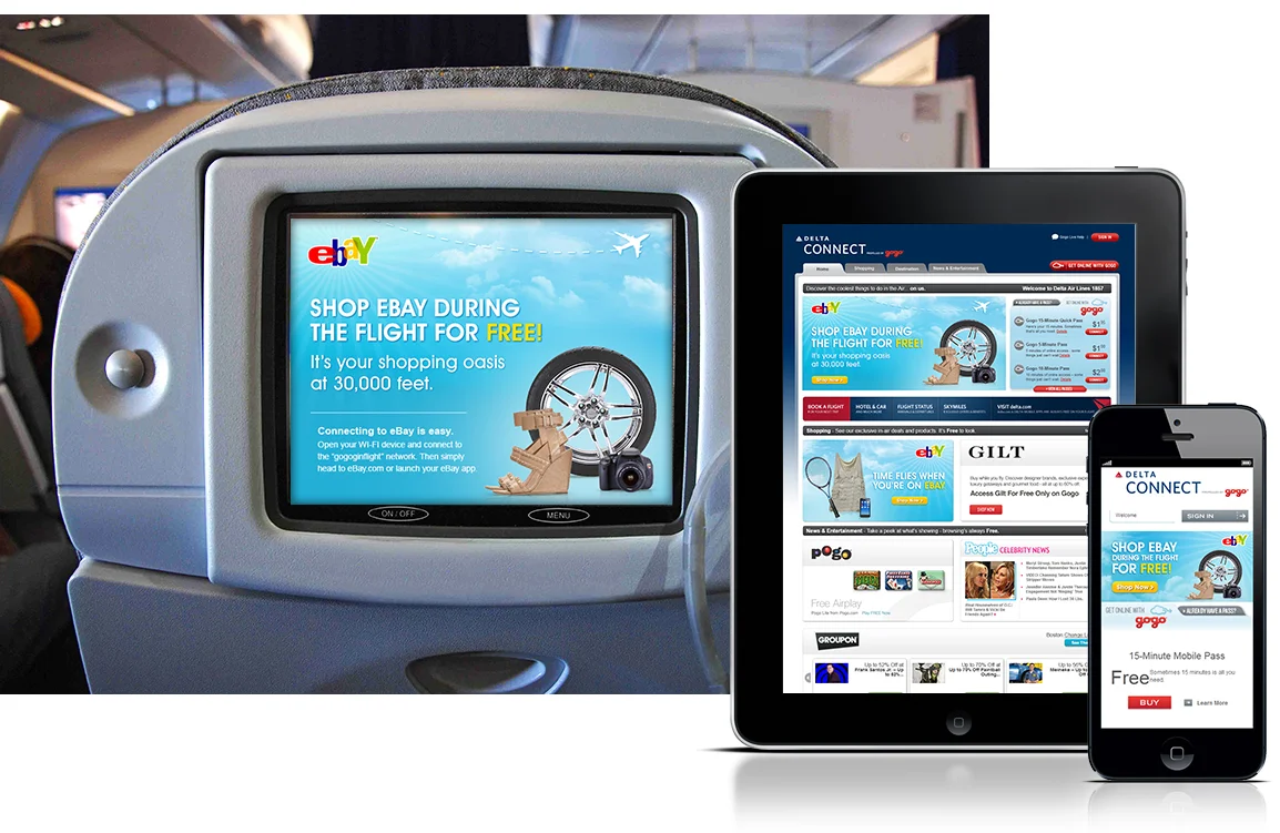 eBay partnered with Gogo, which is an inflight internet service, and advertised on the seats of Delta airplanes. People were able to connect to the Gogo network on their WI-FI device and then simply head to eBay.com or launch their eBay app to shop for free.
