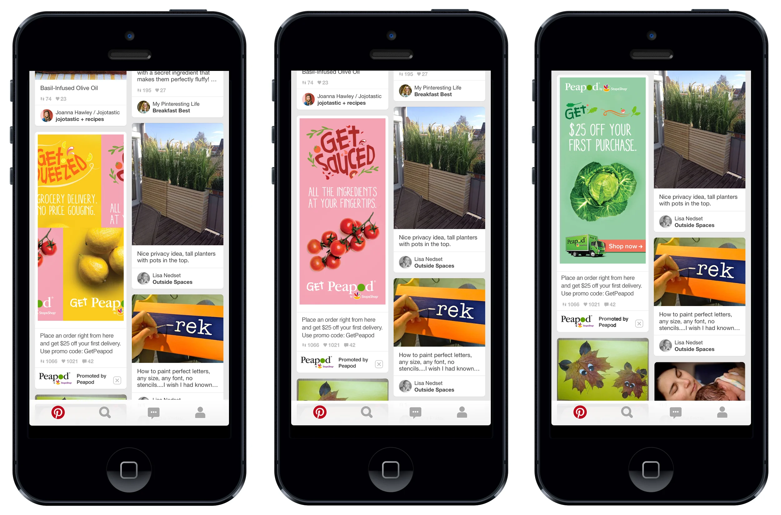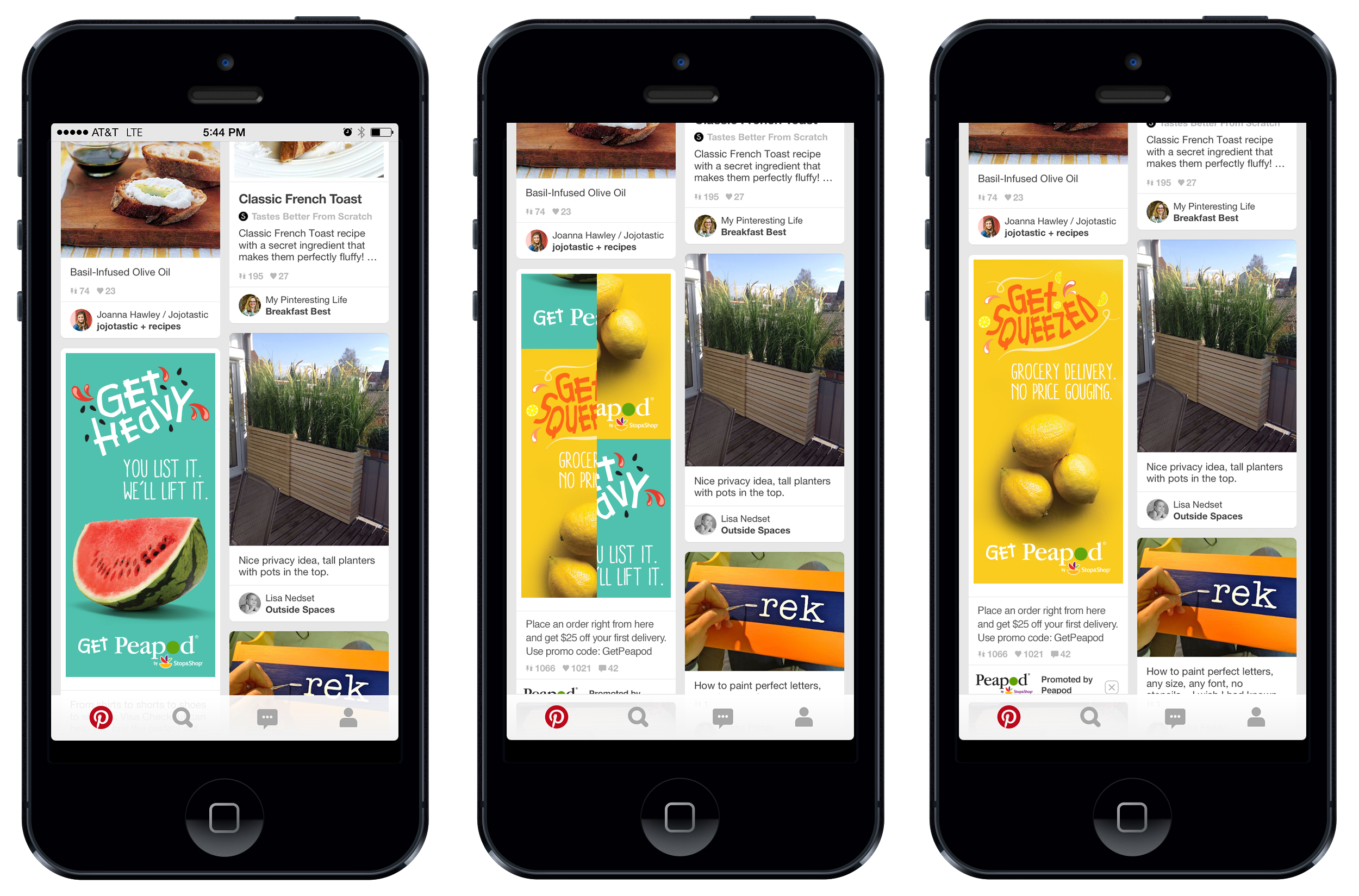 As you scroll down the Pinterest page the Peapod ad would animate through the different messages to catch your eye.