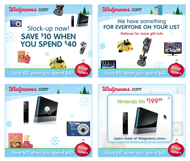 This ad was placed on Yahoo's homepage and linked to Walgreens.com. We wanted to show people the wide variety of gifts Walgreens had to offer for the holidays.