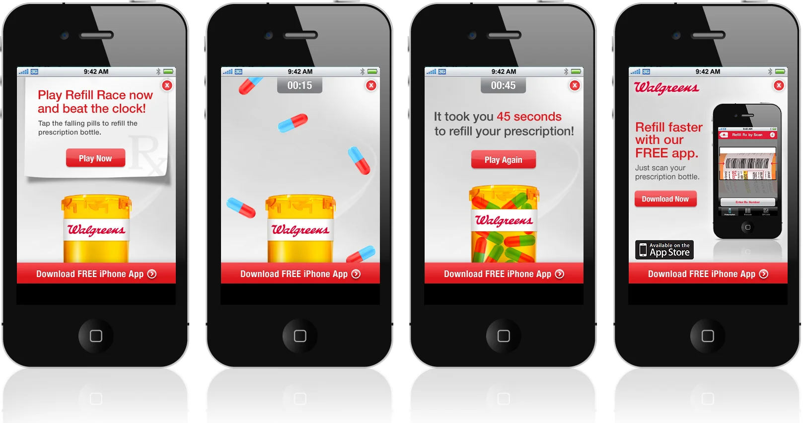 Walgreens wanted more people to know about the benefits of their app. This ad let people play a game while their page loaded on their mobile device. The messaging at the end of the game hits on how fast it is to refill with their free app.