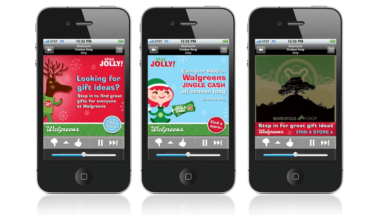 The goal was to make Walgreens relevant for consumers during the holiday season. We provided a Pandora page that played holiday music when the user put a Walgreens gift into the stocking.