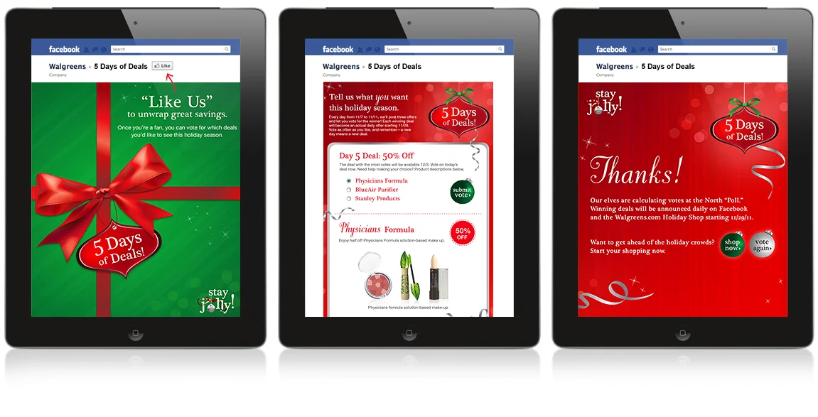 The 5 Days of Deals campaign let Walgreens Facebook fans vote for their favorite deal. At the end of the campaign, the winning deals were released to the fans and they had the option to purchase the discounted package on Walgreens.com.
